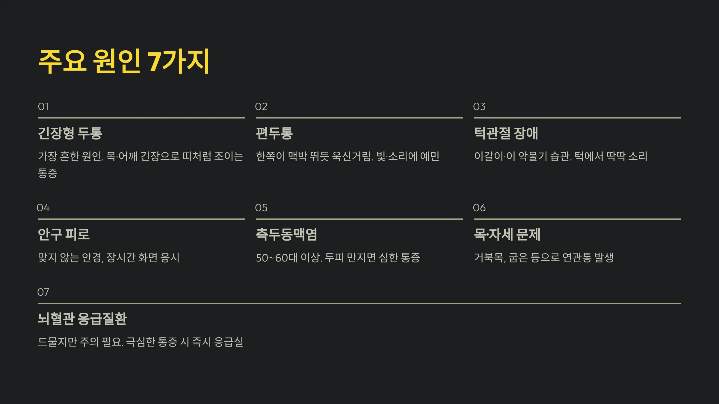 | 편두통 | 한쪽이 욱신거리는 관자놀이 통증 | 빛·소리 예민, 메스꺼움 | 조용한 환경, 편두통 약물 |