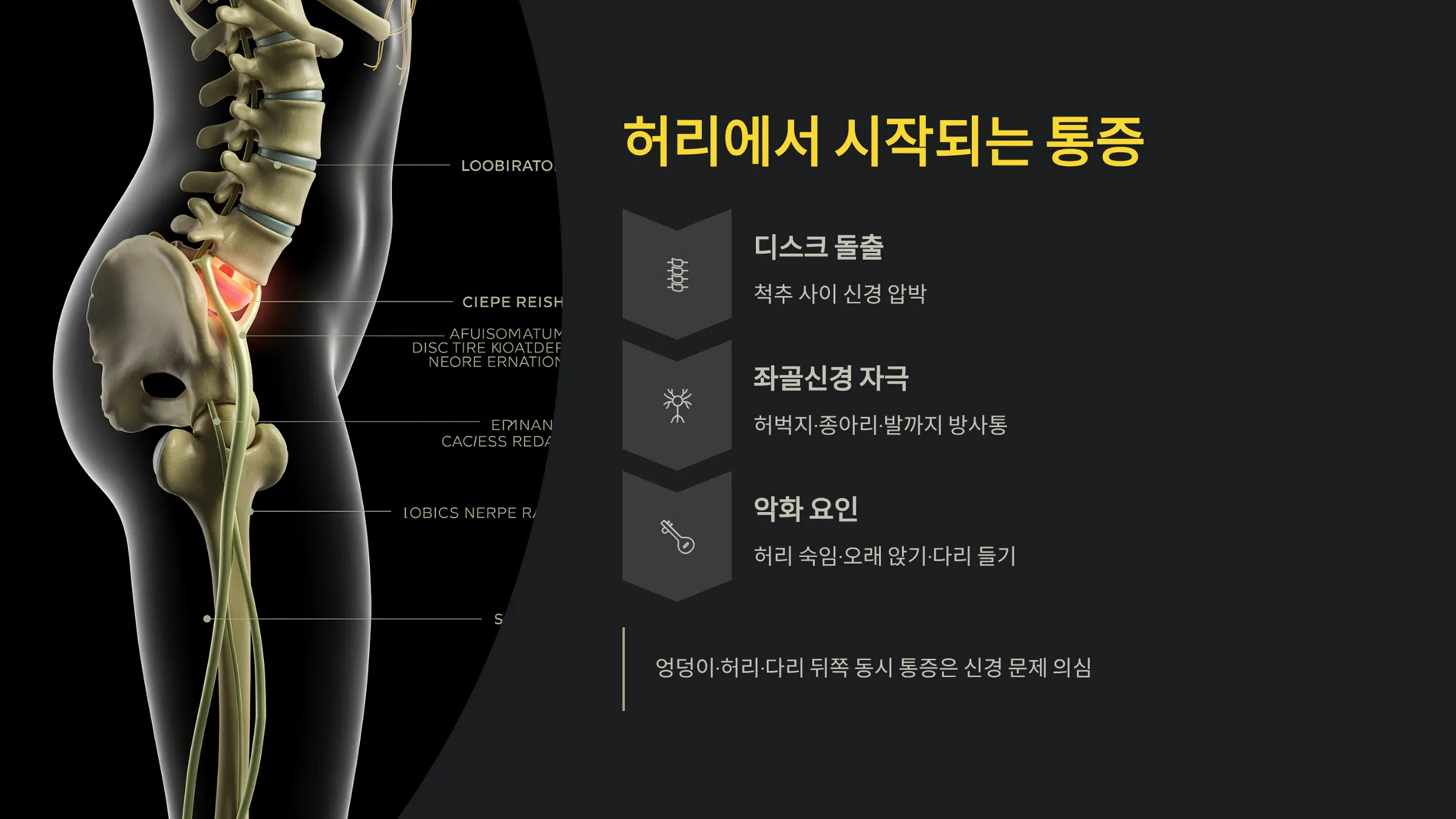 | 허리부터 다리 뒤까지 이어지는 저림 | 좌골신경 주행에 따라 방사통 | 허리 검사를 포함한 신경계 평가 필요 |