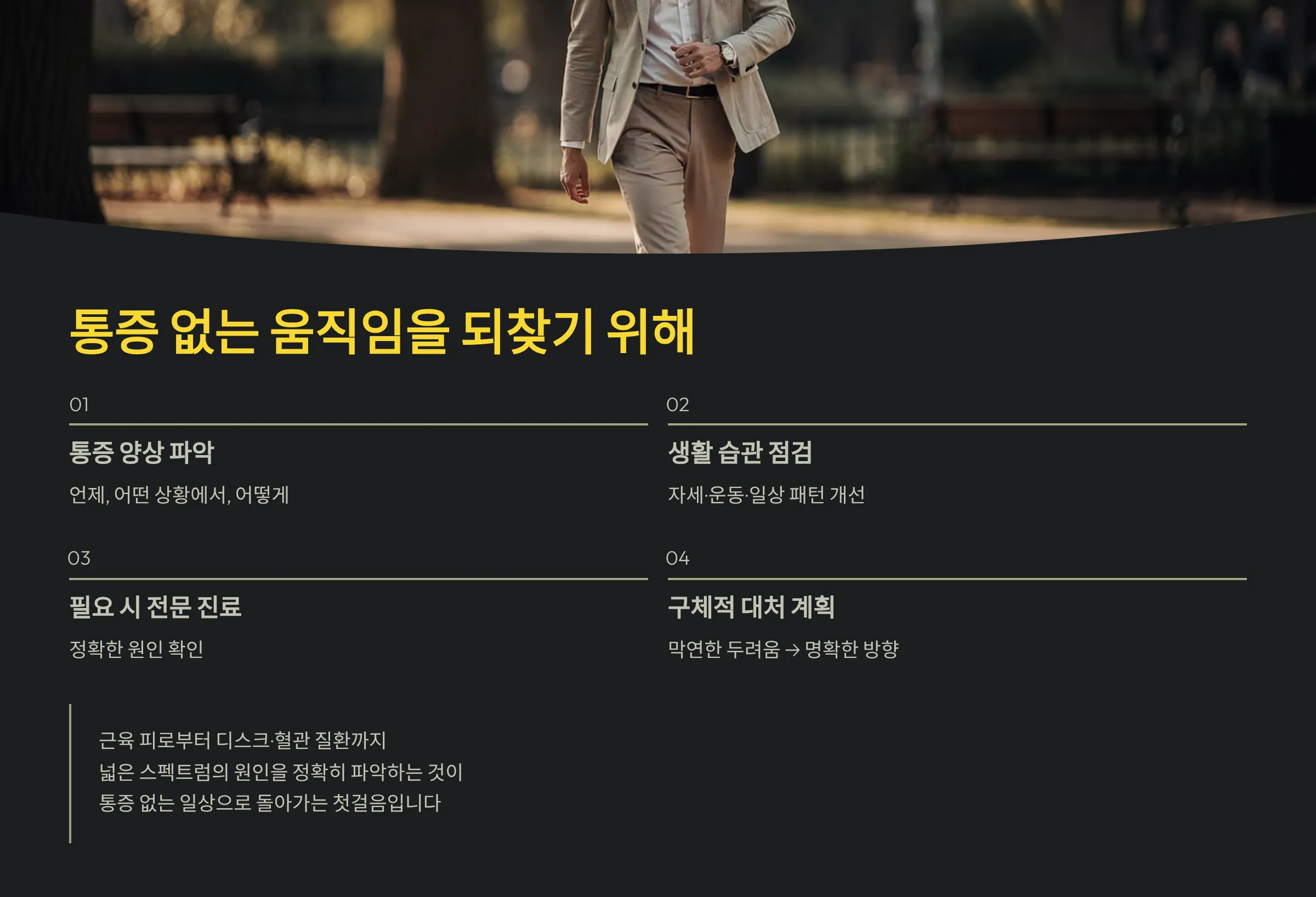 허벅지 뒤쪽 통증 원인은 근육 피로처럼 가벼운 것부터 허리디스크, 혈관 질환처럼 놓치면 위험해질 수 있는 것까지 매우 넓은 스펙트럼을 가집니다. 그래서 단순히 통증의 강도만 볼 것이 아니라 언제, 어떤 상황에서, 어떤 양상으로 나타나는지를 함께 살펴보는 것이 중요합니다. 지금 허벅지 뒤쪽이 반복적으로 아프거나 오래 앉아 있다가 일어날 때마다 통증이 심해진다면, 일단 생활 습관을 점검하고 필요한 경우 전문의 진료를 통해 정확한 원인을 확인해 보시기 바랍니다. 원인을 제대로 알고 나면 막연한 두려움 대신 구체적인 대처 계획이 생기고, 허벅지 뒤쪽 통증 없는 움직임을 되찾기 위한 다음 단계도 훨씬 선명해질 것입니다.