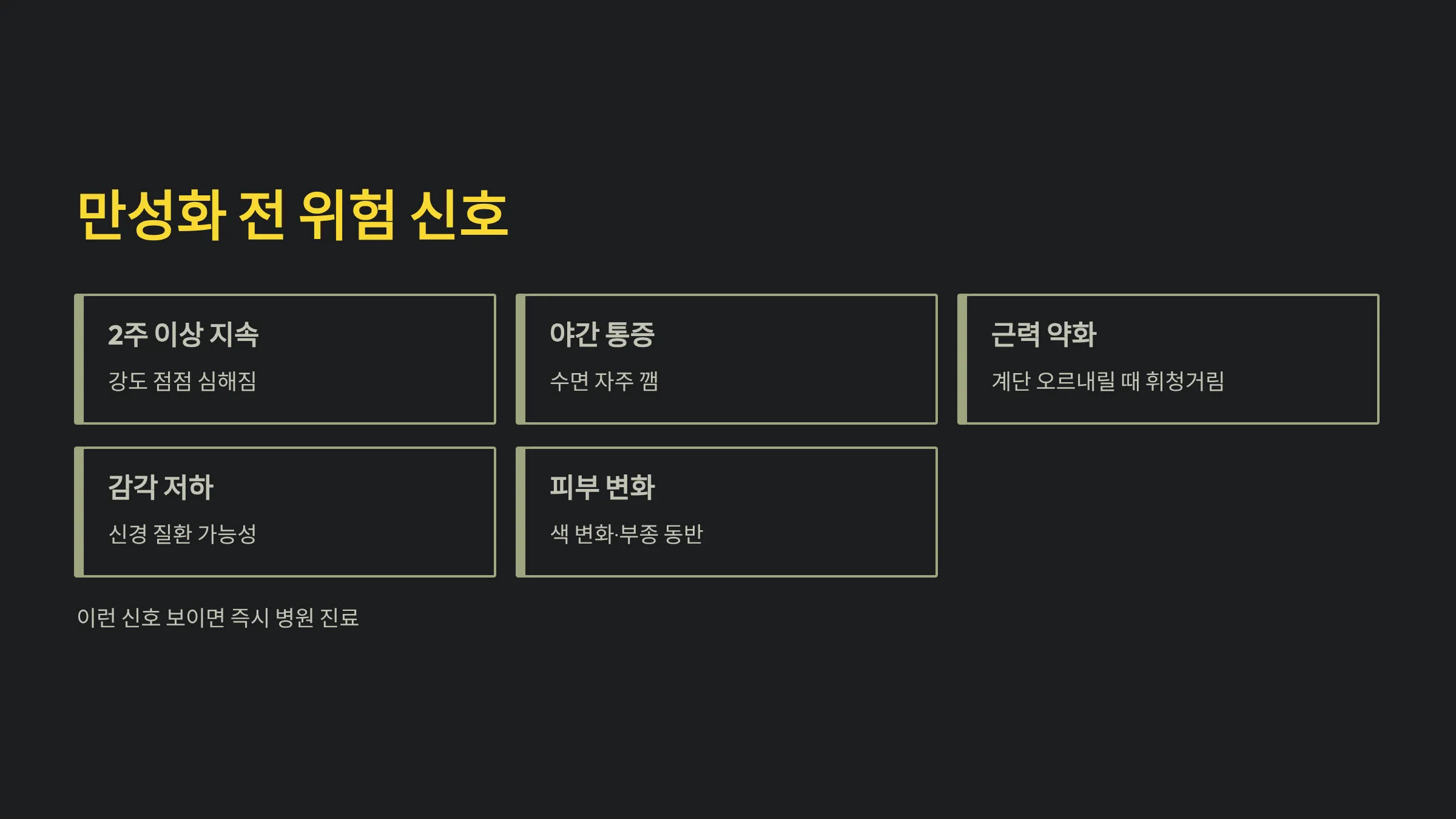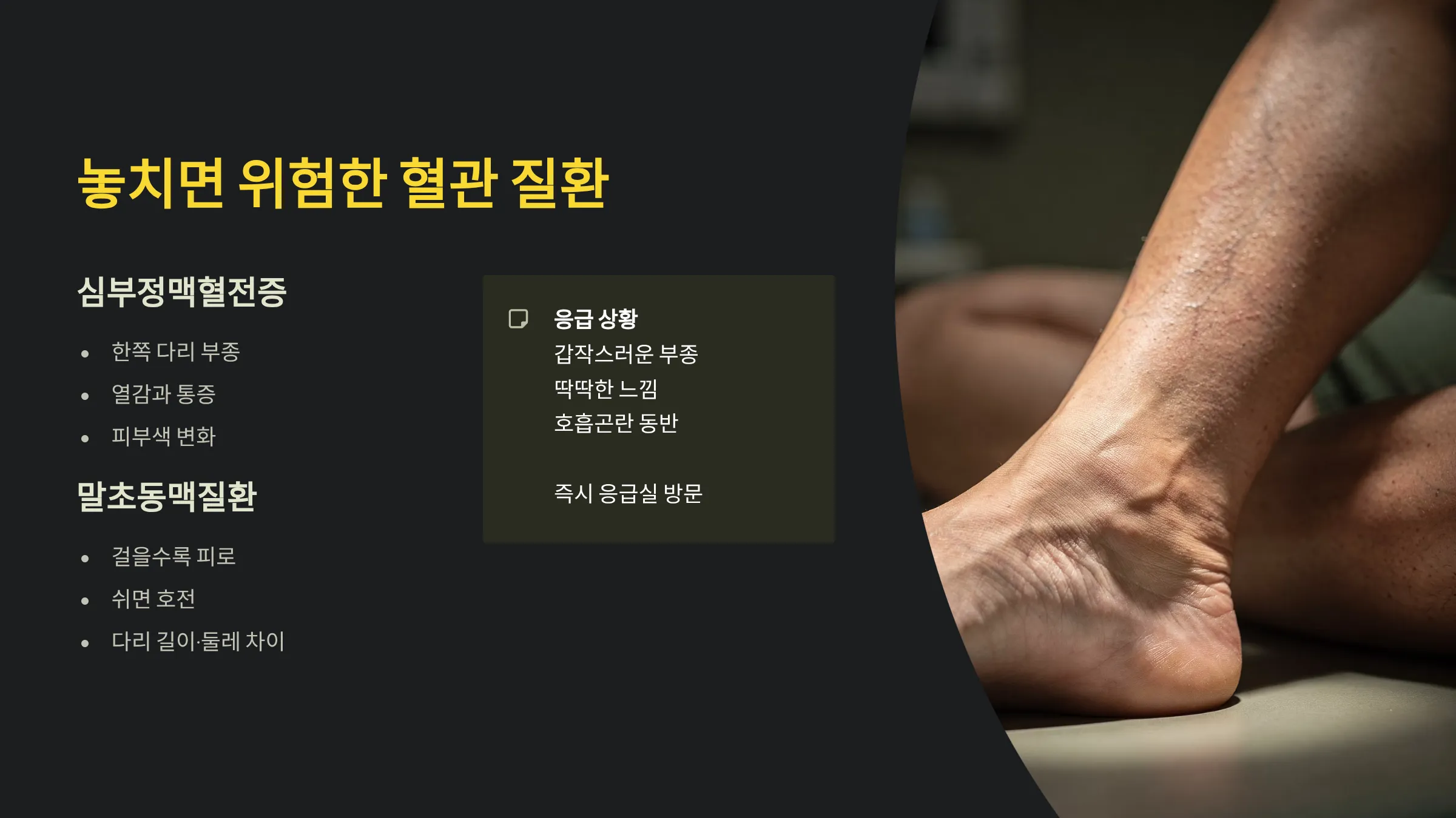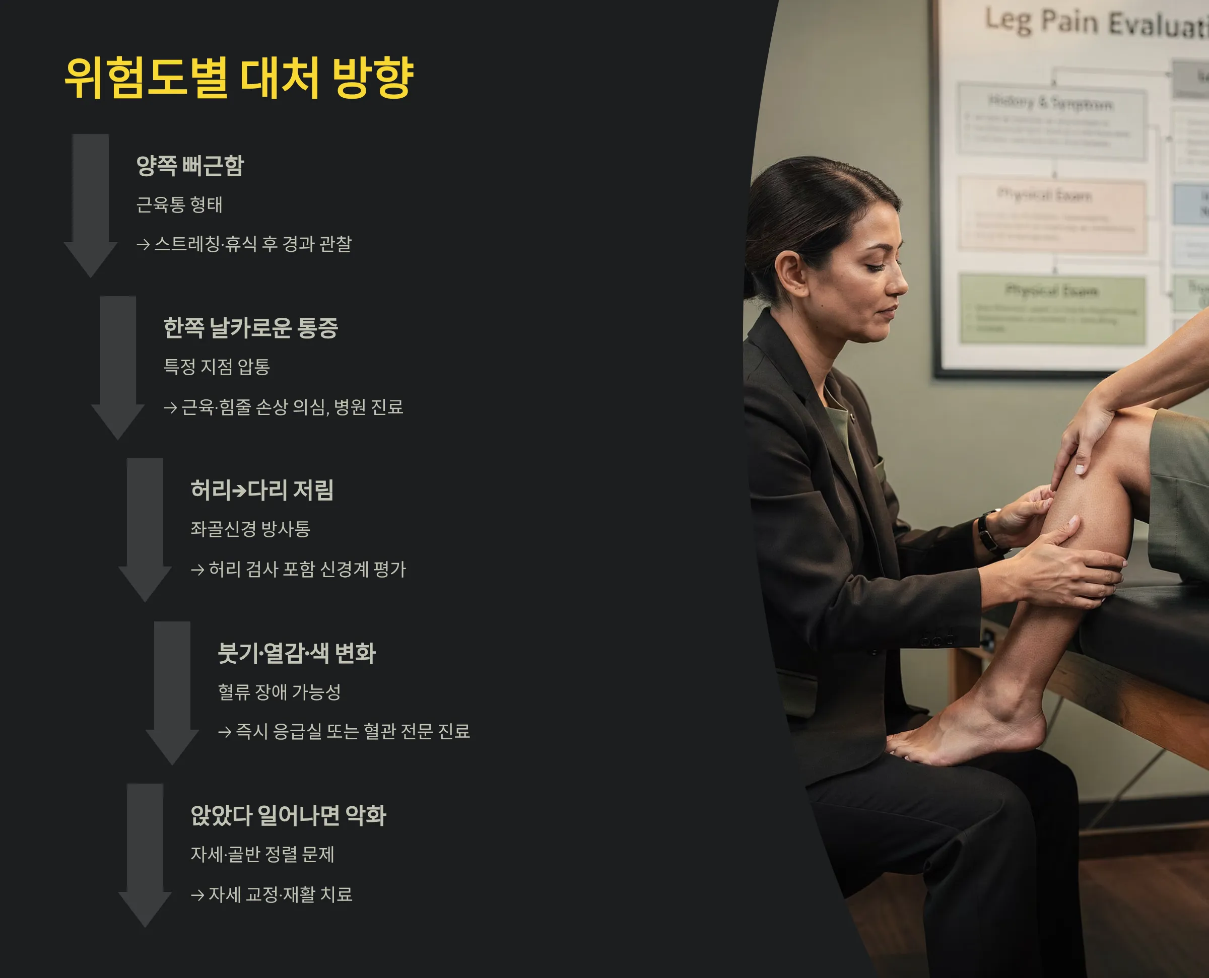| 붓기·열감·색 변화를 동반한 통증 | 혈류 장애 가능성, 응급 상황일 수 있음 | 지체 없이 응급실 또는 혈관 전문 진료 |