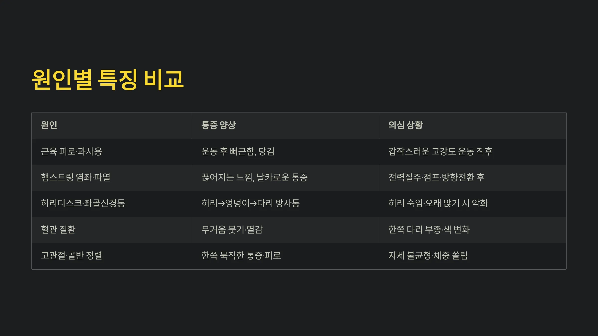 이 표를 보면 허벅지 뒤쪽 통증 원인이 단순 근육 피로인지, 허리나 혈관 같은 다른 구조 문제인지 감을 잡을 수 있습니다. 통증이 시작된 상황과 함께 비교해 보면 스스로 어떤 범주에 가까운지 대략적인 방향을 정하는 데 도움이 됩니다.