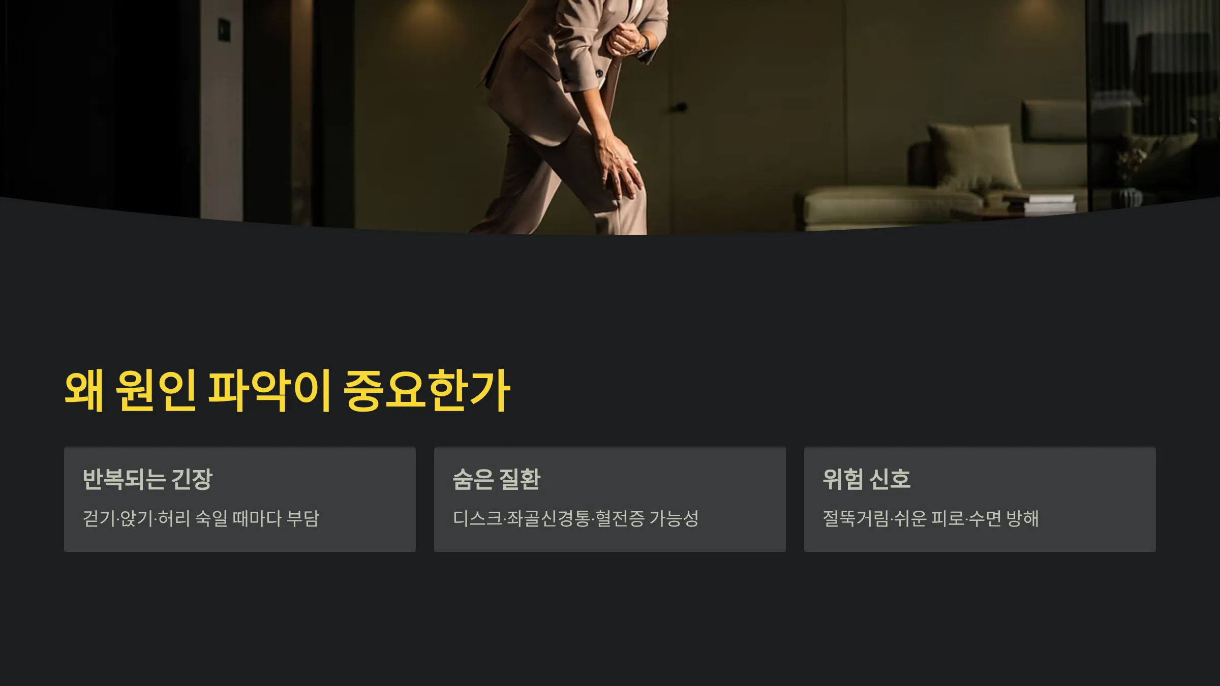 | 허리디스크·좌골신경통 | 허리에서 엉덩이, 다리 뒤로 이어지는 방사통 | 허리를 숙이거나 오래 앉아 있을 때 악화 |