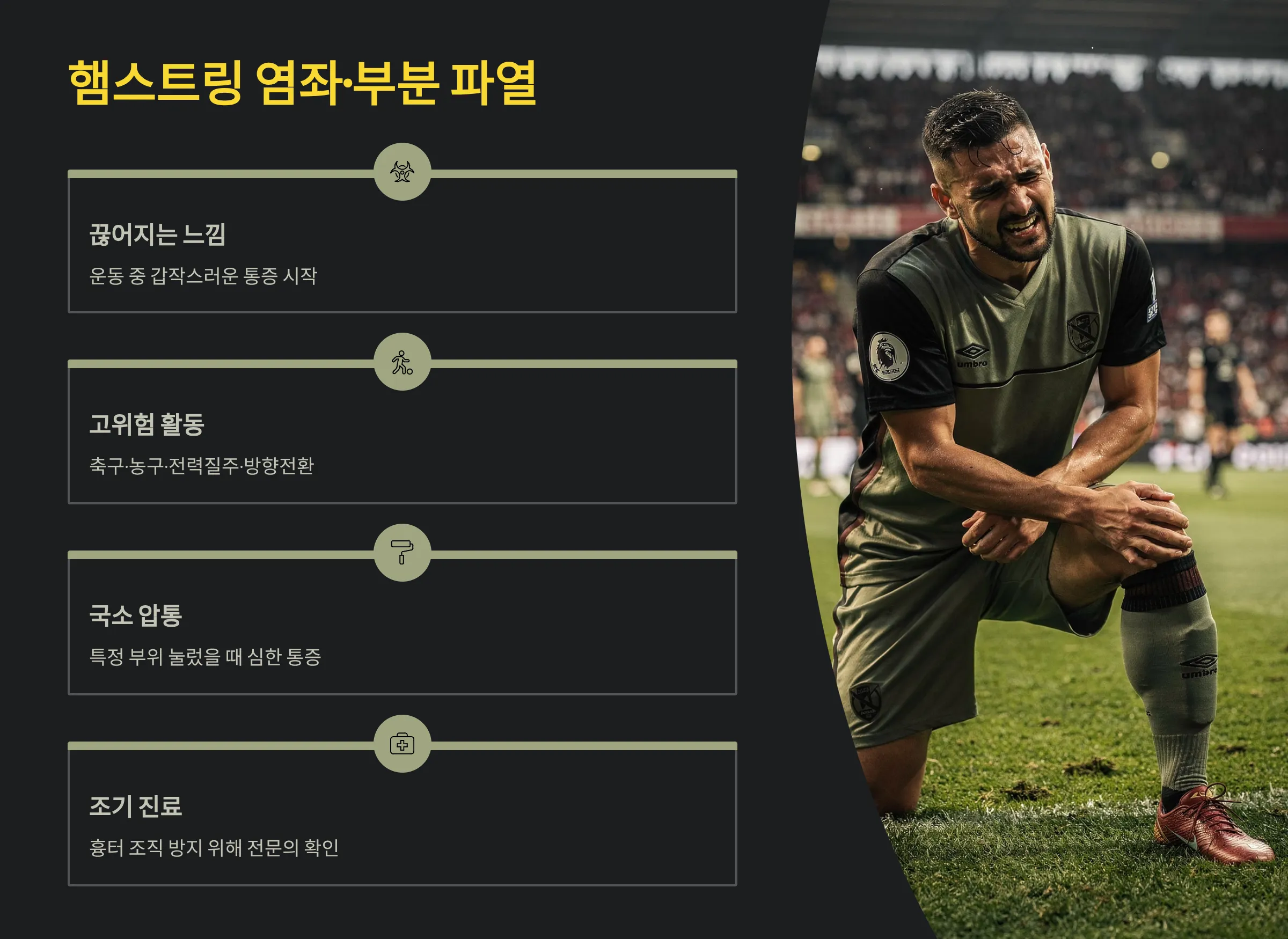 | 햄스트링 염좌·파열 | 끊어지는 느낌, 특정 지점의 날카로운 통증 | 전력 질주, 점프, 방향 전환 후 바로 통증 시작 |