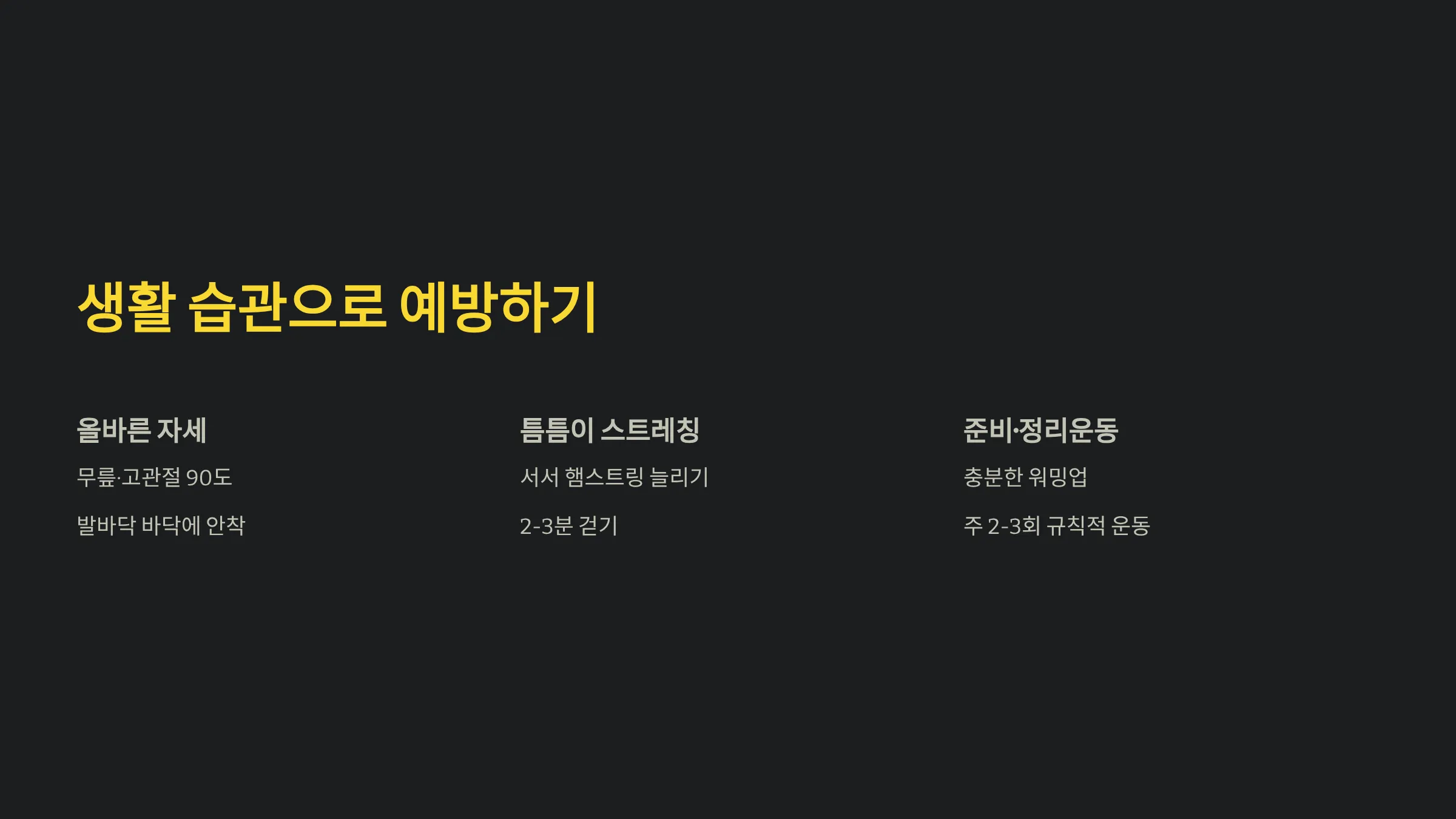 장시간 의자에 앉아 있거나 다리를 꼬는 습관, 허리를 둥글게 말고 앉는 자세는 허벅지 뒤쪽 근육과 허리, 골반 전체에 부담을 줍니다. 의자 높이를 조절해 무릎과 고관절 각도가 90도가 되도록 하고, 발바닥이 바닥에 안정적으로 닿도록 하는 것만으로도 허벅지 뒤쪽 통증 원인을 줄이는 데 도움이 됩니다. 하루 중 틈틈이 서서 햄스트링을 부드럽게 늘려 주는 스트레칭을 하고, 오래 앉았다면 일어나서 2~3분 정도 걷는 습관을 들이는 것도 좋습니다. 갑자기 강도가 높은 운동을 시작하기보다는 준비운동과 정리운동을 충분히 하고, 일주일에 2~3회 정도 규칙적으로 하체 근육을 사용하는 루틴을 만드는 것이 안전합니다.