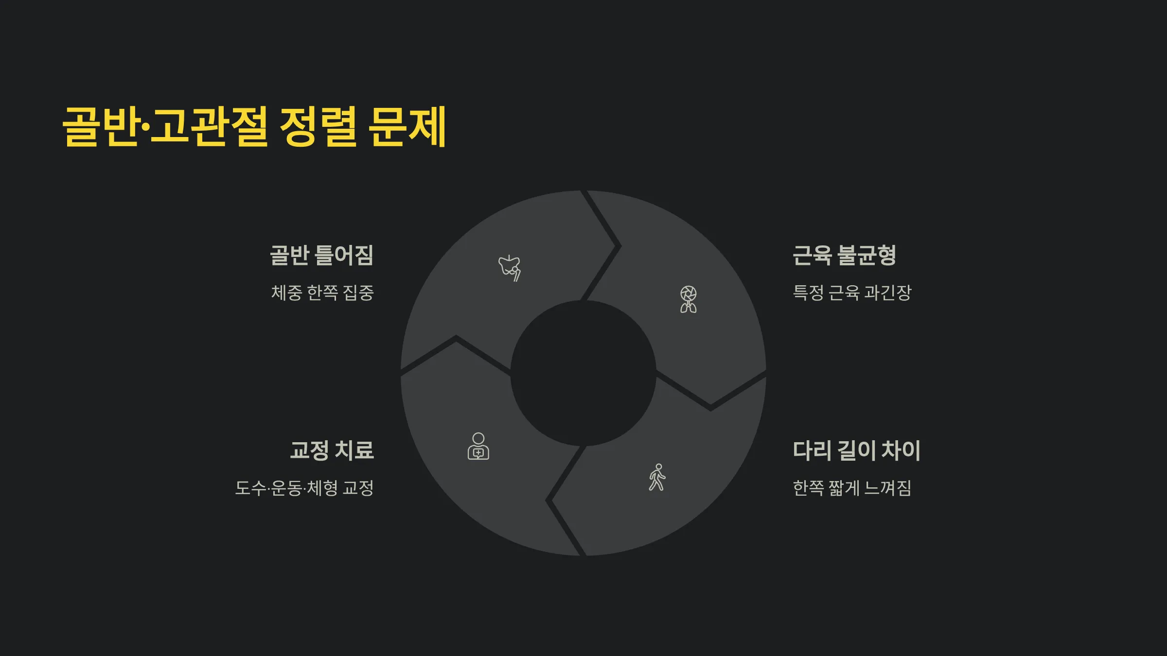 | 고관절·골반 정렬 문제 | 한쪽에만 묵직한 통증과 피로감 | 자세 불균형, 한쪽으로 체중이 쏠리는 습관 |