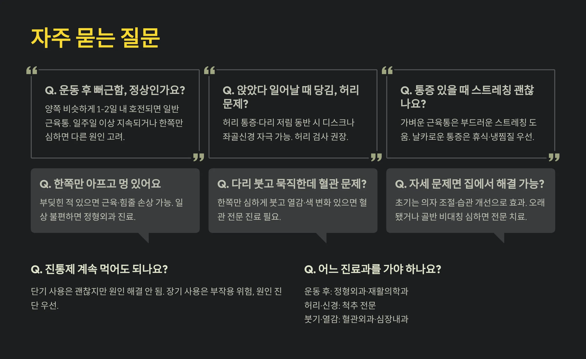 A8. 운동 후 통증이 시작되었다면 정형외과나 재활의학과, 허리·신경 증상이 동반되면 척추 전문 진료과를 고려할 수 있습니다. 다리가 붓거나 열감이 있다면 혈관외과·심장내과 쪽 평가가 필요할 수 있으므로 증상 양상에 따라 진료과를 선택하는 것이 좋습니다.