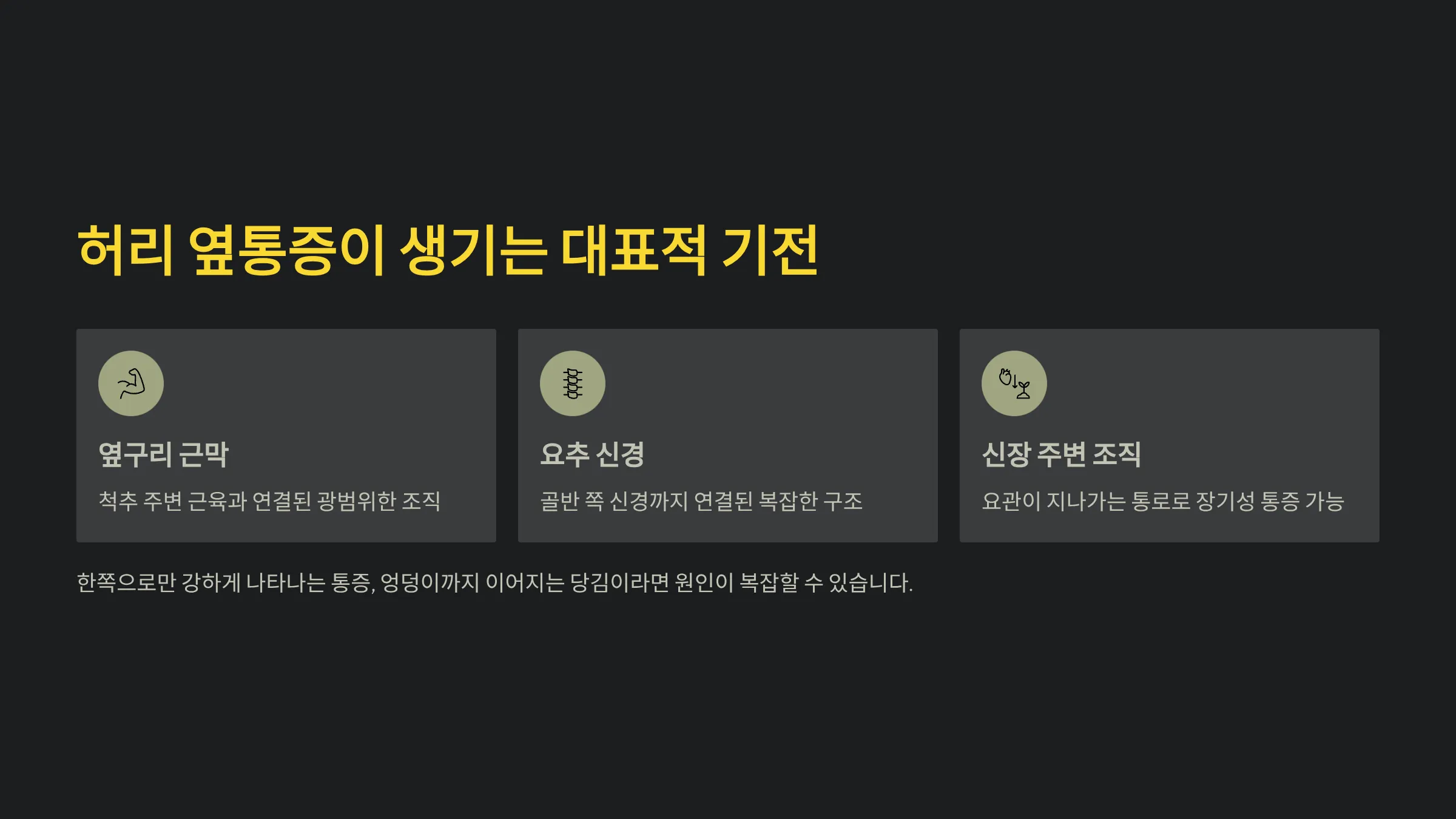허리 옆통증은 단순히 허리 근육만의 문제가 아니라 옆구리 근막, 척추 주변 근육, 요추 신경, 골반 쪽 신경, 신장 주변 조직까지 광범위하게 연관되어 통증이 발생할 수 있습니다. 특히 이 부위는 신장과 요관이 지나가는 통로이기 때문에 장기성 통증일 가능성도 배제할 수 없습니다. 한쪽으로만 강하게 나타나는 통증, 엉덩이 라인까지 이어지는 당김, 깊숙한 통증 같은 양상이라면 그만큼 원인도 복잡할 수 있습니다. 이런 이유 때문에 허리 옆통증은 원인을 정확히 짚지 않으면 치료 과정이 길어지기 쉽습니다.