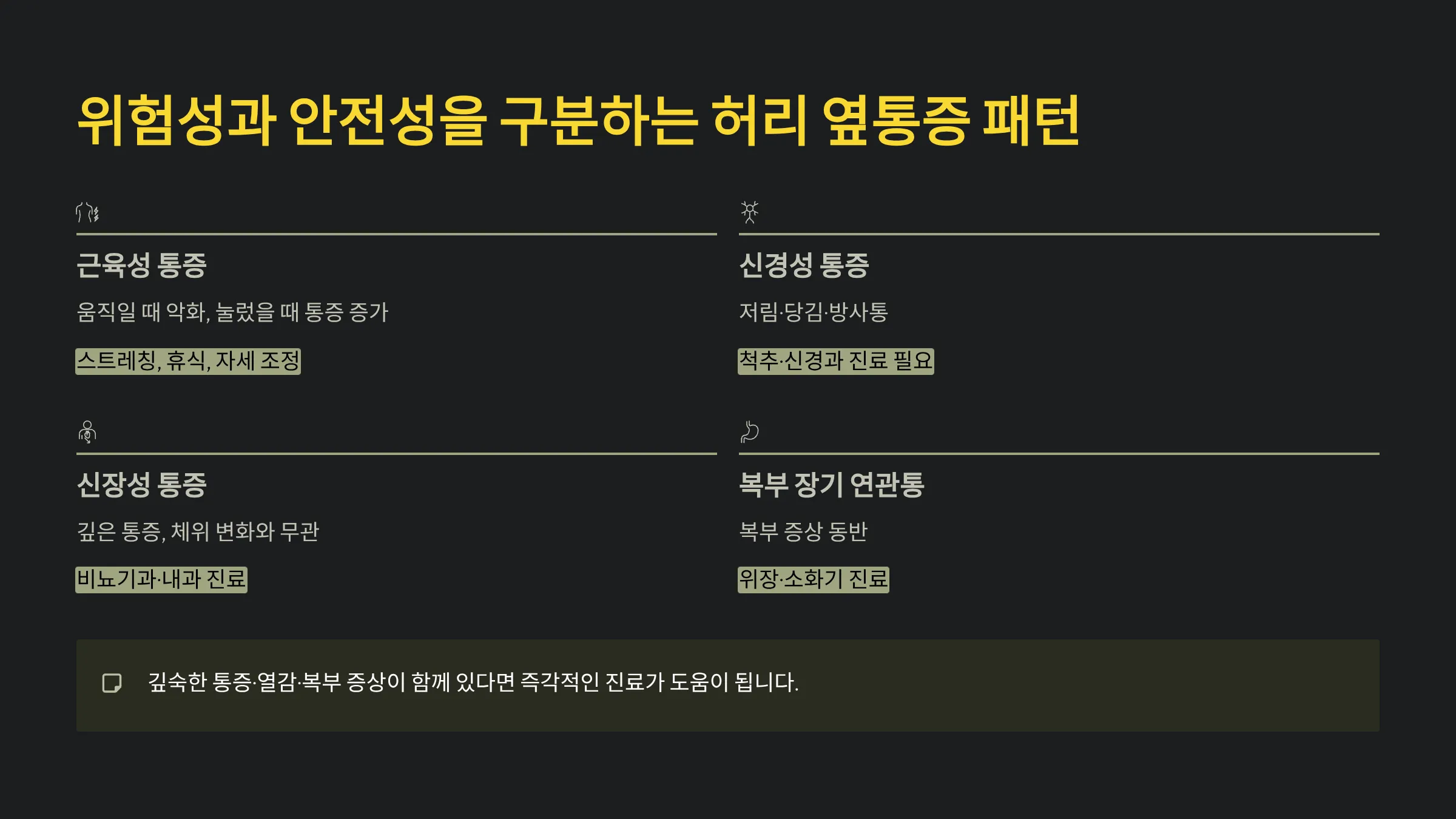 이 표를 통해 허리 옆통증이 근육성인지, 신경성인지, 장기성인지 대략적으로 구분할 수 있습니다. 양상과 동반 증상을 함께 살피면 정확한 판단에 도움이 됩니다.