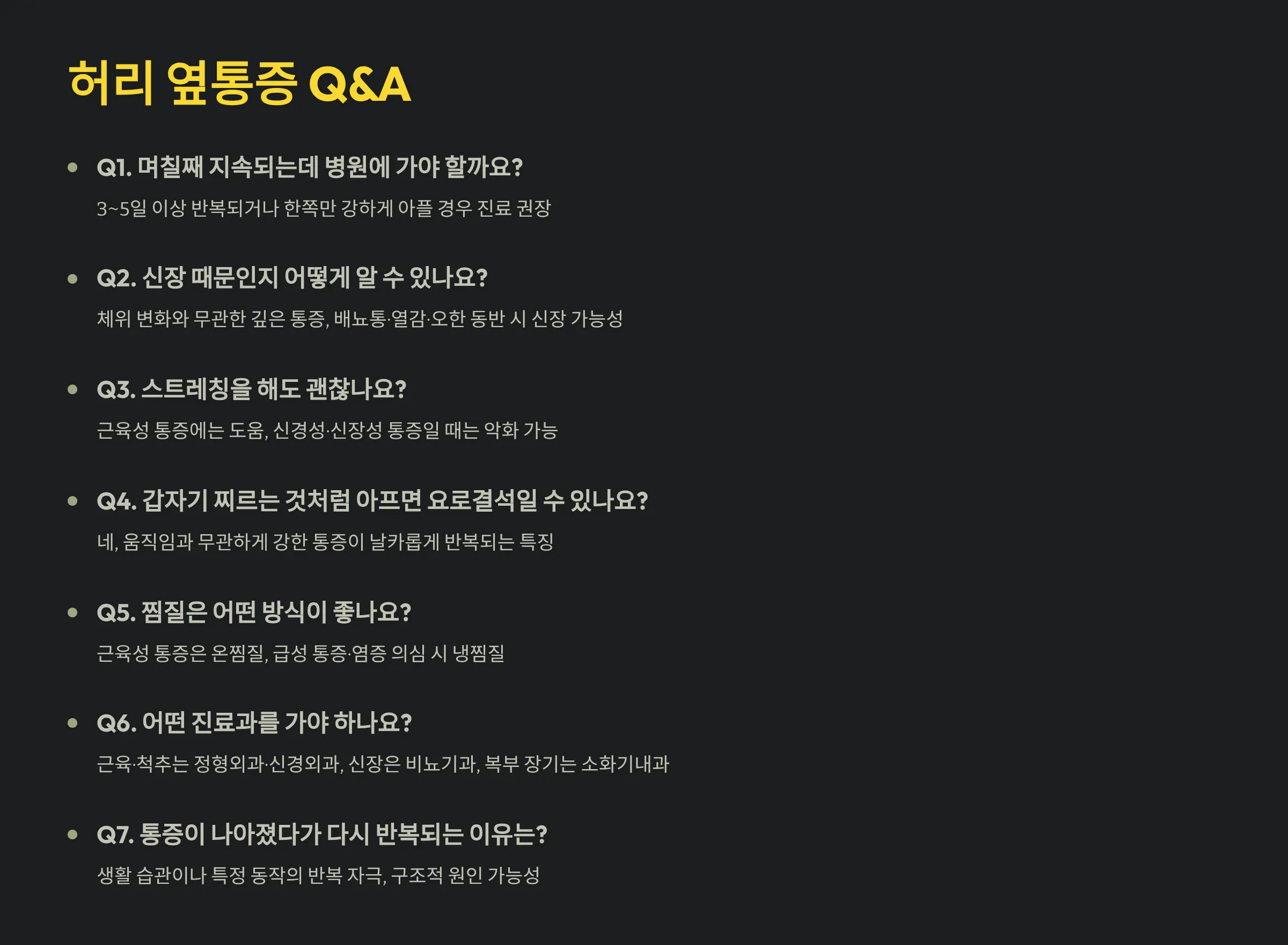 Q1. 허리 옆통증이 며칠째 지속되는데 병원에 가야 할까요?